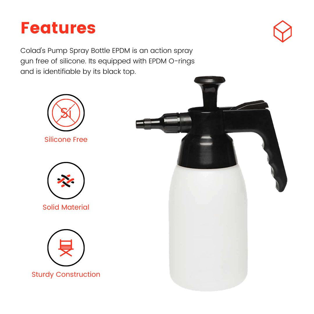 Colad's Pump Spray Bottle EPDM is an action spray gun free of silicone. Its equipped with (black) EPDM O-rings, unlike the VITON O-rings on the plain variety.