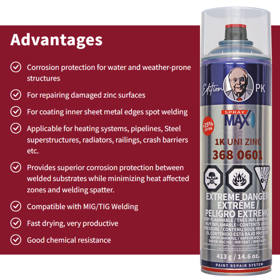 Special Edition SprayMax 1K Uni Zinc 3680601 500ml is perfect for corrosion protection on water and weather-prone constructions. It's also great for repairing damaged zinc surfaces and for coating inner panel edges during spot welding. Use it on heating systems, pipelines, steel structures, radiators, railings, crash barriers, and more for superior corrosion protection without damaging heat affected zones or welding splatter.