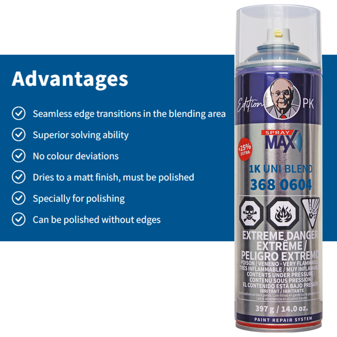 SprayMax 1K Uni Blend is a revolutionary high-performance spray product designed to provide homogeneous transitions in 1K and 2K clear coats and 2K top coats with excellent results. It offers great release properties, no color deviations, and can be polished without a tear-off edge. Achieve transition-free edge zones and professional spot coating results with Special Edition SprayMax 1K Uni Blend.
