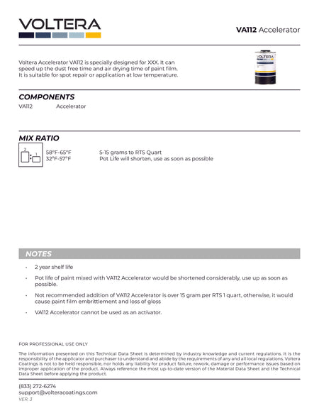 Voltera VA112 Accelerator is the trusted solution for professionals who can’t afford to wait. Whether you’re refinishing a car, coating industrial equipment, or working on high-quality custom finishes, this additive delivers dependable speed and superior results every time.