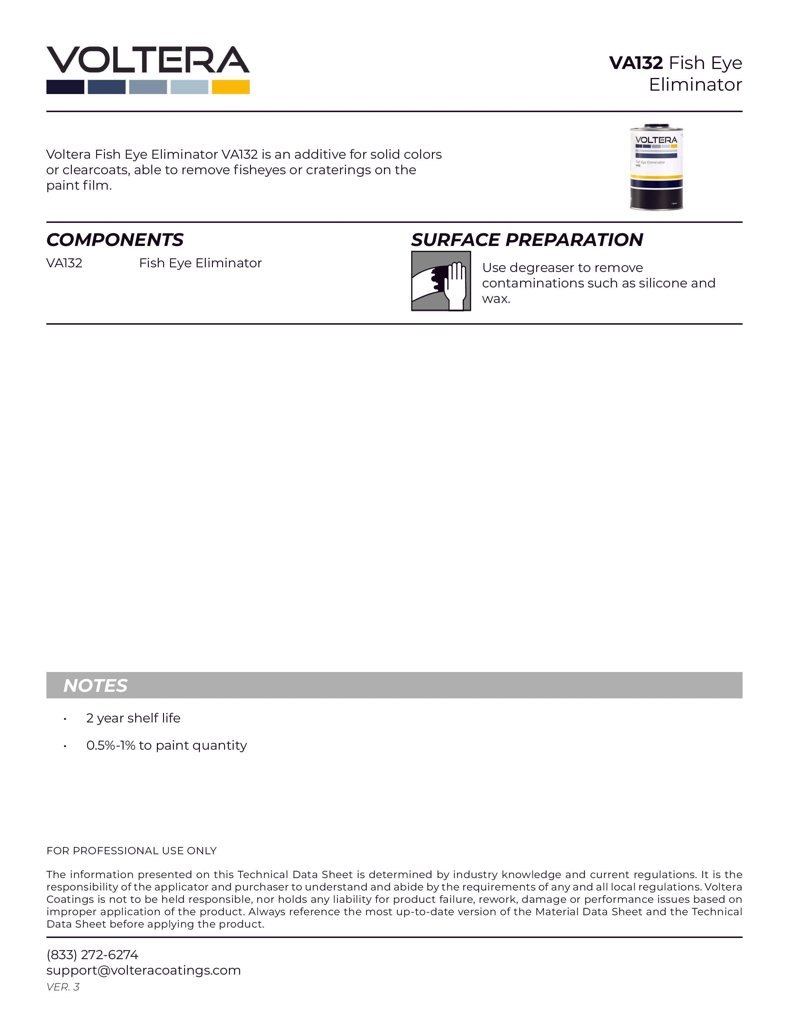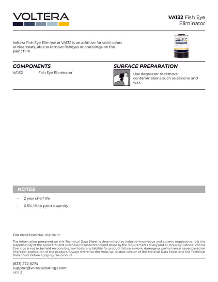 The Voltera VA132 Fish Eye Eliminator is a professional-grade additive designed to prevent and correct fish eyes—small craters or circular surface defects caused by silicone contamination or surface tension irregularities—in automotive paint and clear coat systems. Formulated for use in both solvent-based and high-performance urethane clear coats, VA132 ensures an even, high-gloss finish free of surface blemishes.